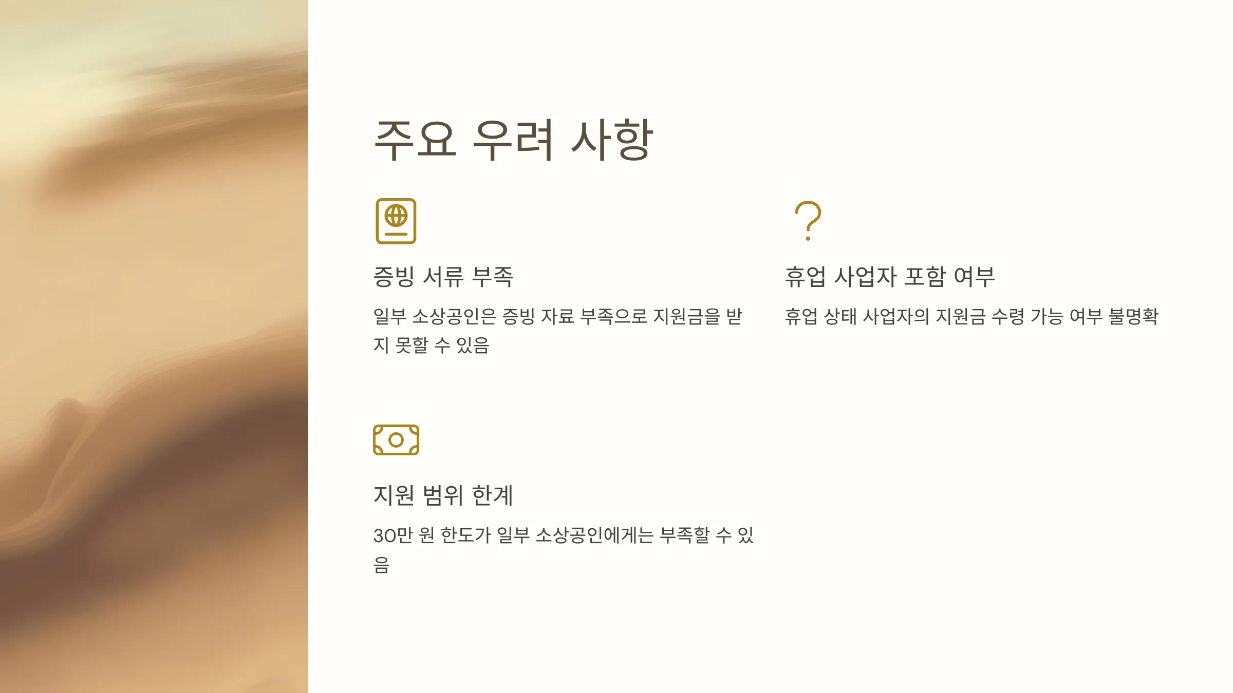 - 휴업 사업자의 포함 여부: 규정이 명확하지 않아 휴업 상태의 사업자가 지원금을 받을 수 있을지에 대한 우려가 존재합니다. 이는 정책이 시행되기 전까지 보다 구체적인 지침이 필요합니다.