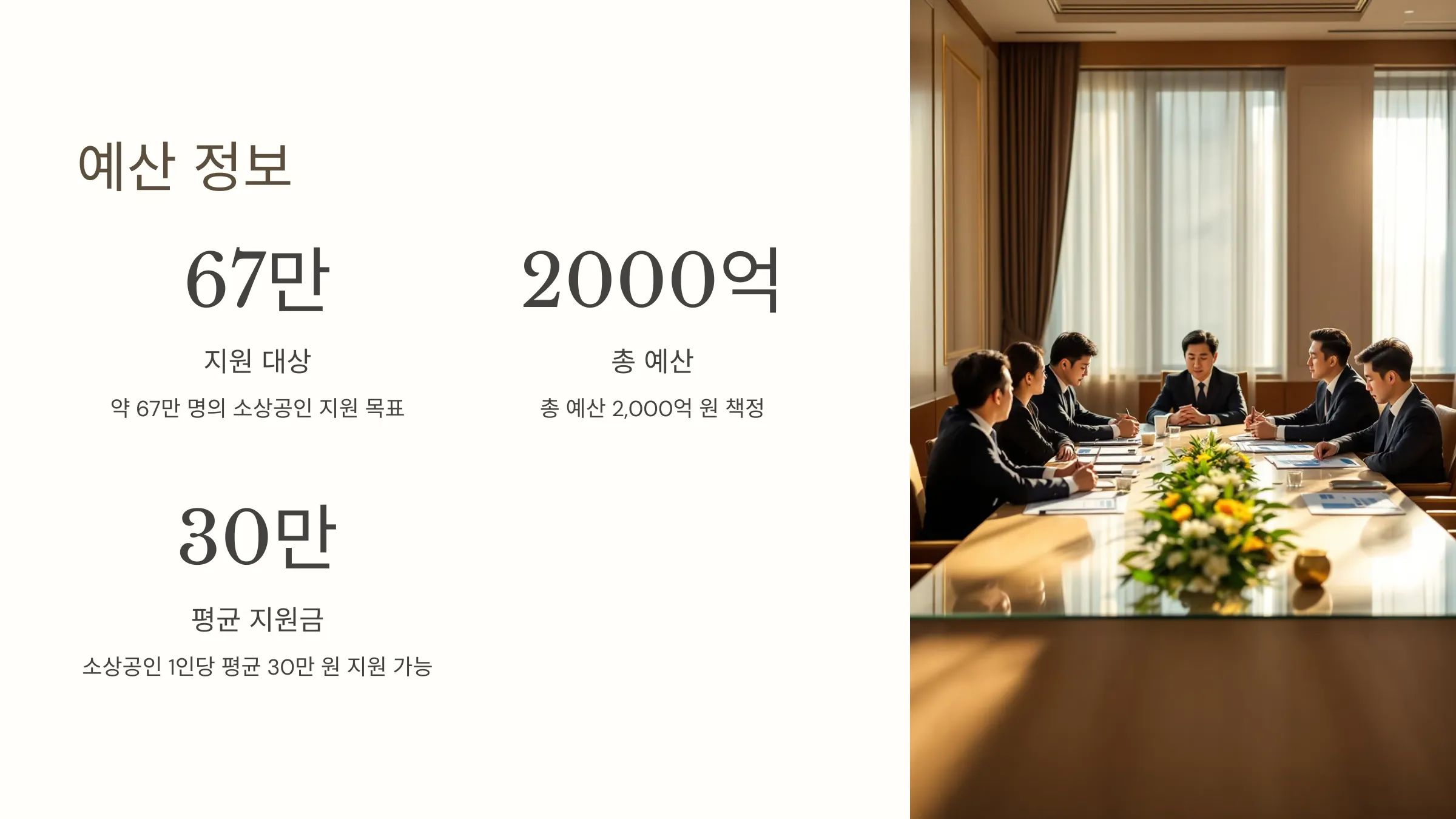 - 이 제도는 약 67만 명의 소상공인 지원을 목표로 하고 있으며, 총 예산은 2,000억 원으로 책정되었습니다. 이는 소상공인 1인당 평균 30만 원을 지원할 수 있는 규모입니다.