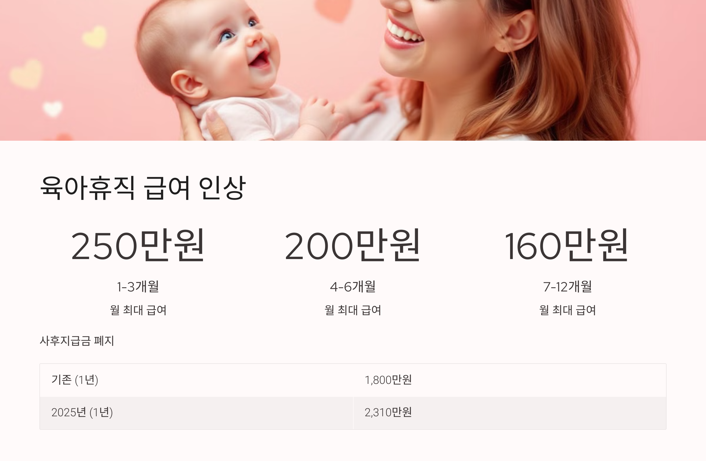 - 육아휴직 급여 최대 2,310만 원: 1~3개월 차 월 250만 원, 4~6개월 차 월 200만 원, 7~12개월 차 월 160만 원 지급. 사후지급금 폐지로 상한액 전액 수령 가능.