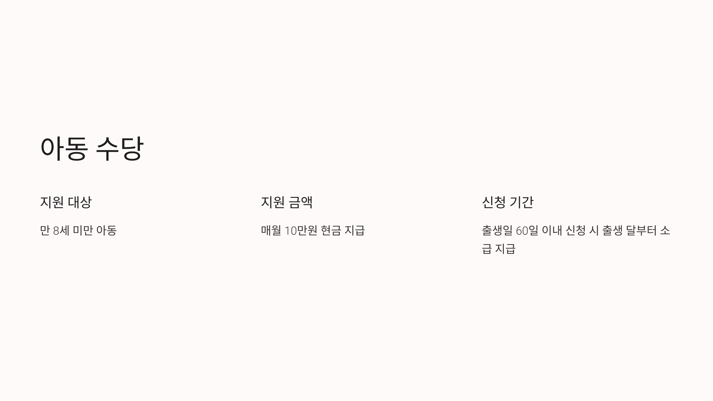 - 출생일 60일 이내 신청 시 출생 달부터 소급 지급.