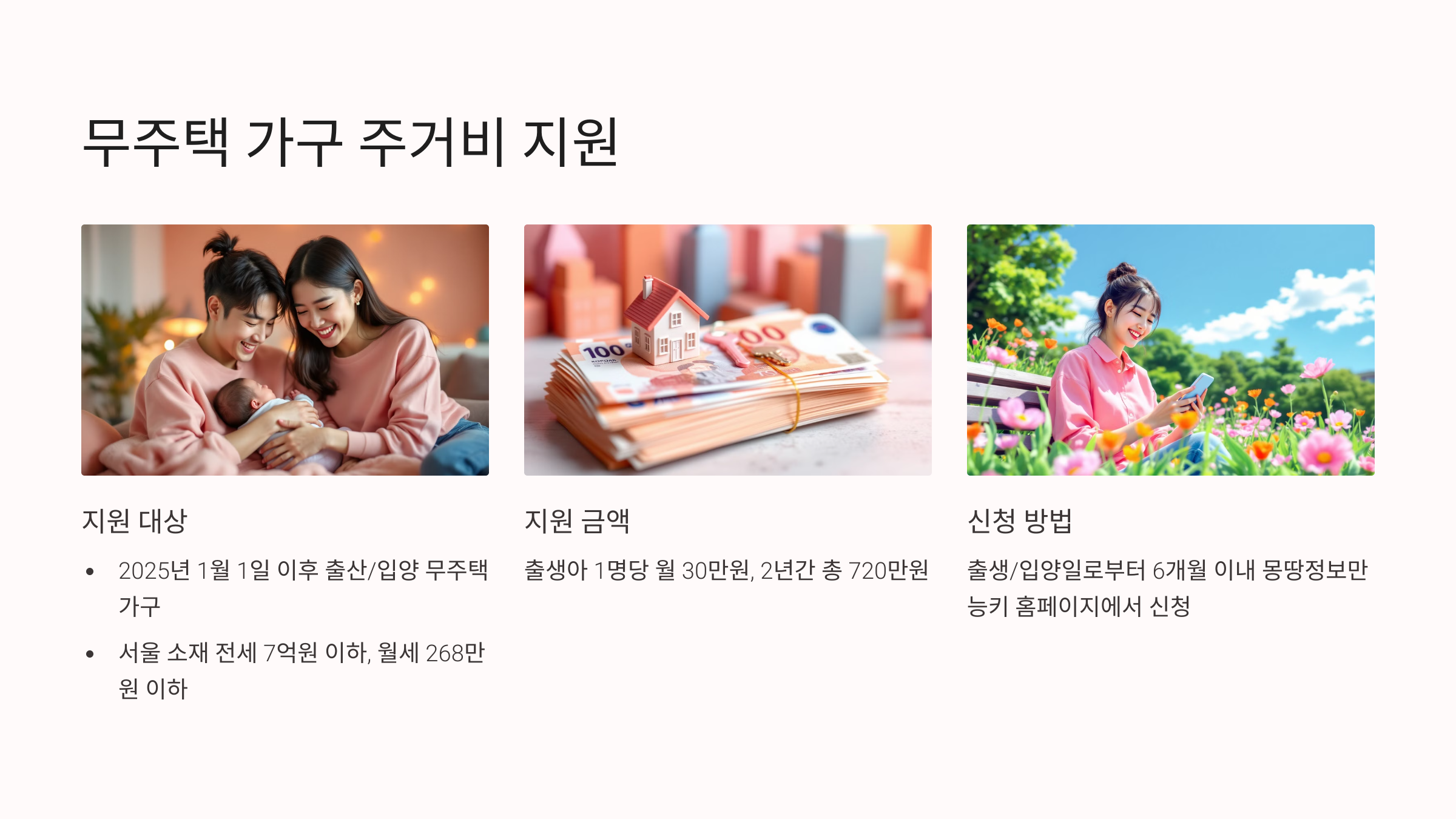 - 2025년 1월 1일 이후 출산 혹은 입양한 무주택 가구에 출생아 1명당 월 30만 원씩 2년간 총 720만 원 지원.