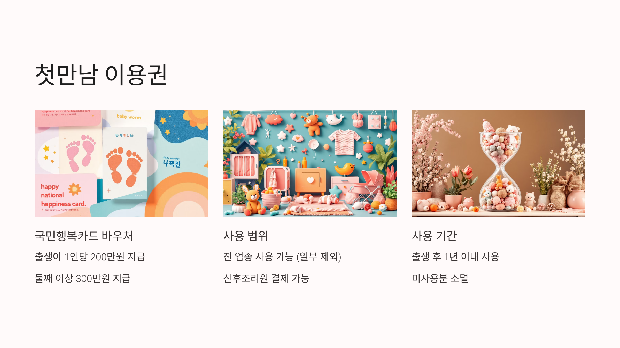 - 출생아 1인당 200만 원 (둘째 이상 300만 원) 국민행복카드 바우처 형태로 지급.