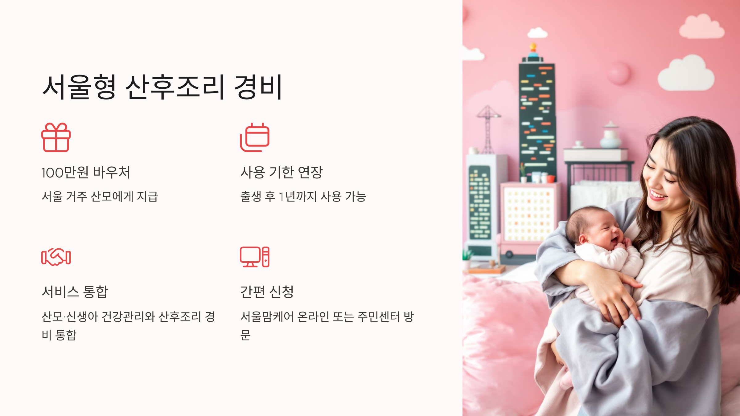 - 서울 거주 산모에게 100만 원 상당 바우처 지급.