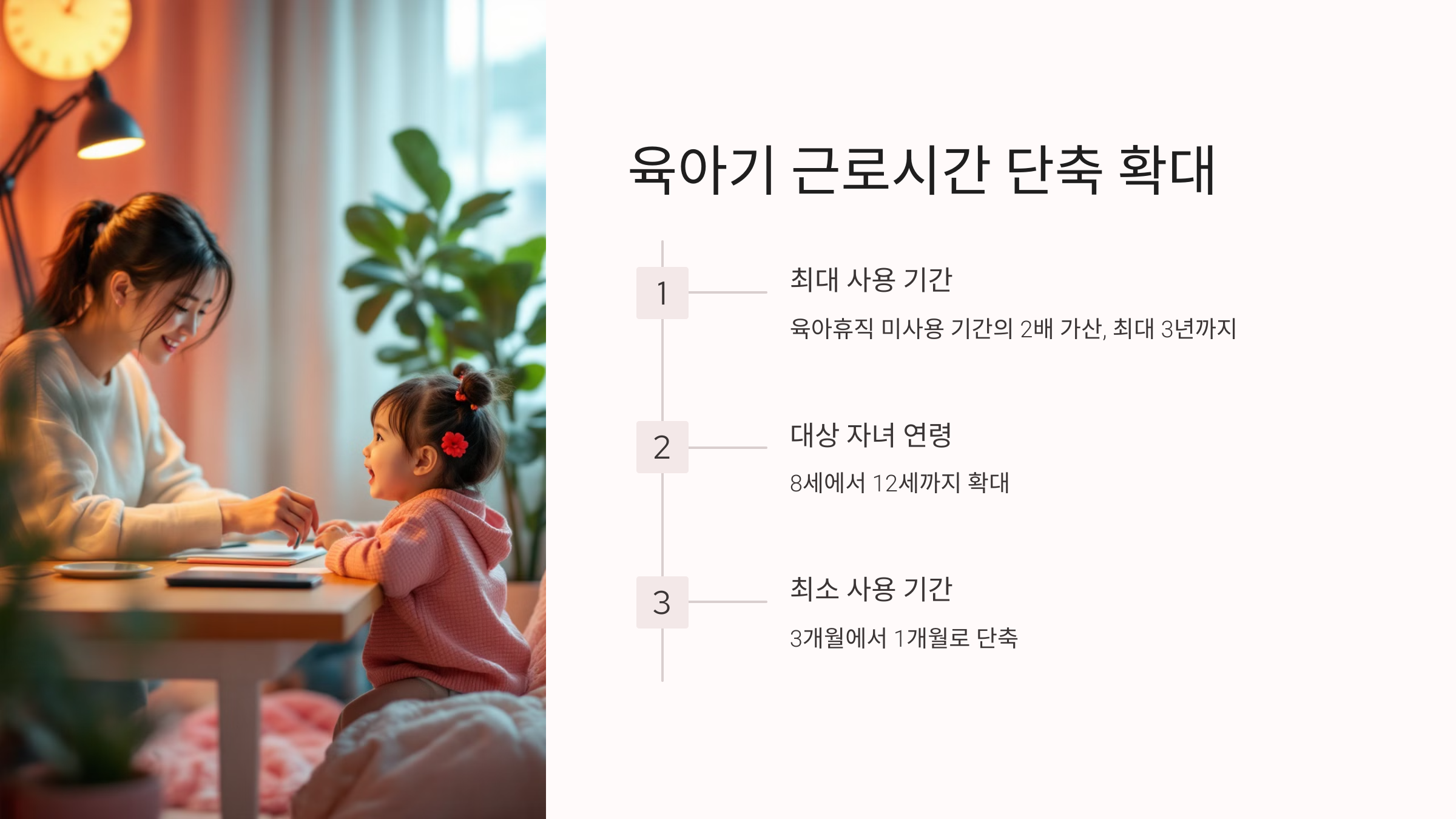 - 육아기 근로시간 단축 확대: 최대 3년까지 사용 가능, 대상 자녀 연령 12세까지 확대, 최소 사용 기간 1개월로 단축.