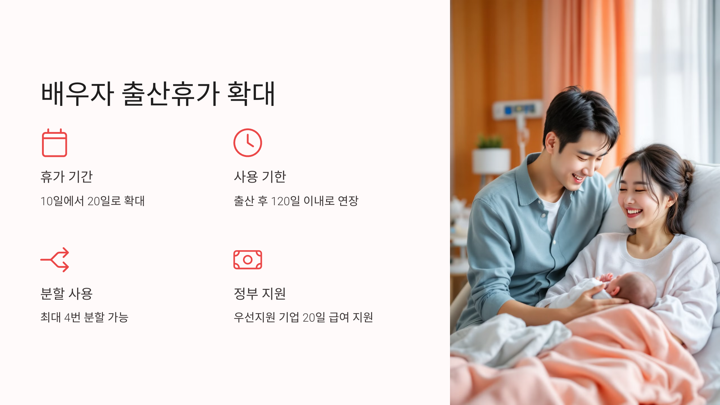 - 배우자 출산휴가 20일로 확대: 분할 횟수 3회로 증가, 사용 기한 출산 후 120일 이내로 연장.