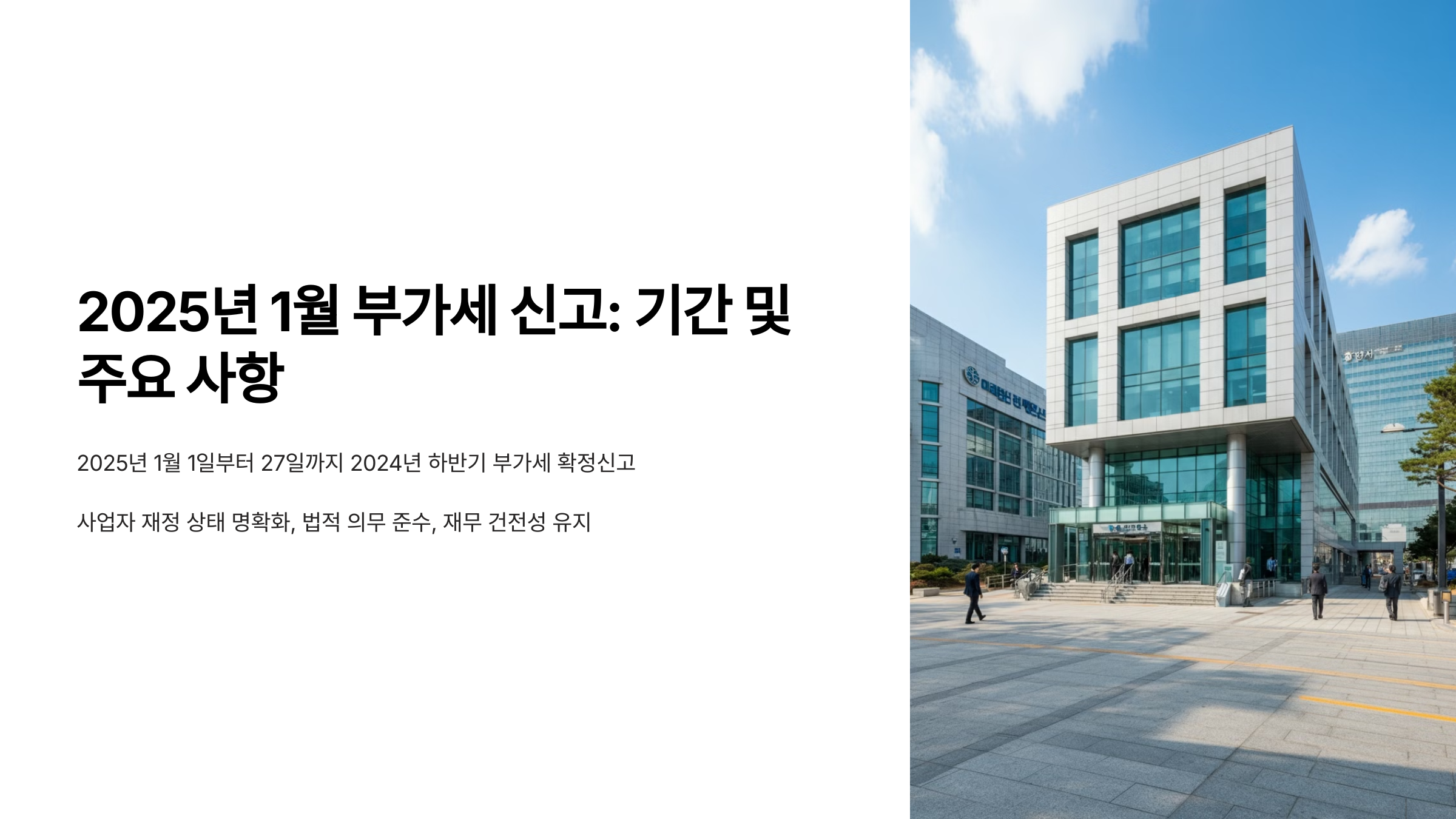 2025년 1월 부가가치세 확정신고가 시작됩니다. 부가세는 정부가 상품과 서비스 거래에서 발생하는 가치를 기준으로 부과하는 중요한 세금입니다. 이번 신고는 사업자가 재정 상태를 명확히 하고, 법적 의무를 준수하며, 재무 건전성을 유지하는 데 중대한 역할을 합니다. 이번 신고는 2024년 하반기(7월 1일부터 12월 31일까지)의 과세 기간에 해당하며, 사업자들은 2025년 1월 1일부터 1월 27일(월)까지 신고를 완료해야 합니다. 부가세 신고는 사업자 의무를 이행하고 사업의 재무 건전성을 유지하는 데 필수적입니다. 아래는 이번 부가세 신고와 관련된 주요 정보를 상세히 안내합니다.