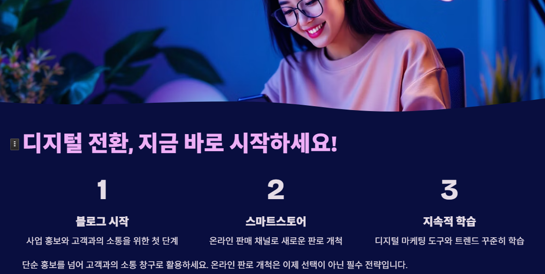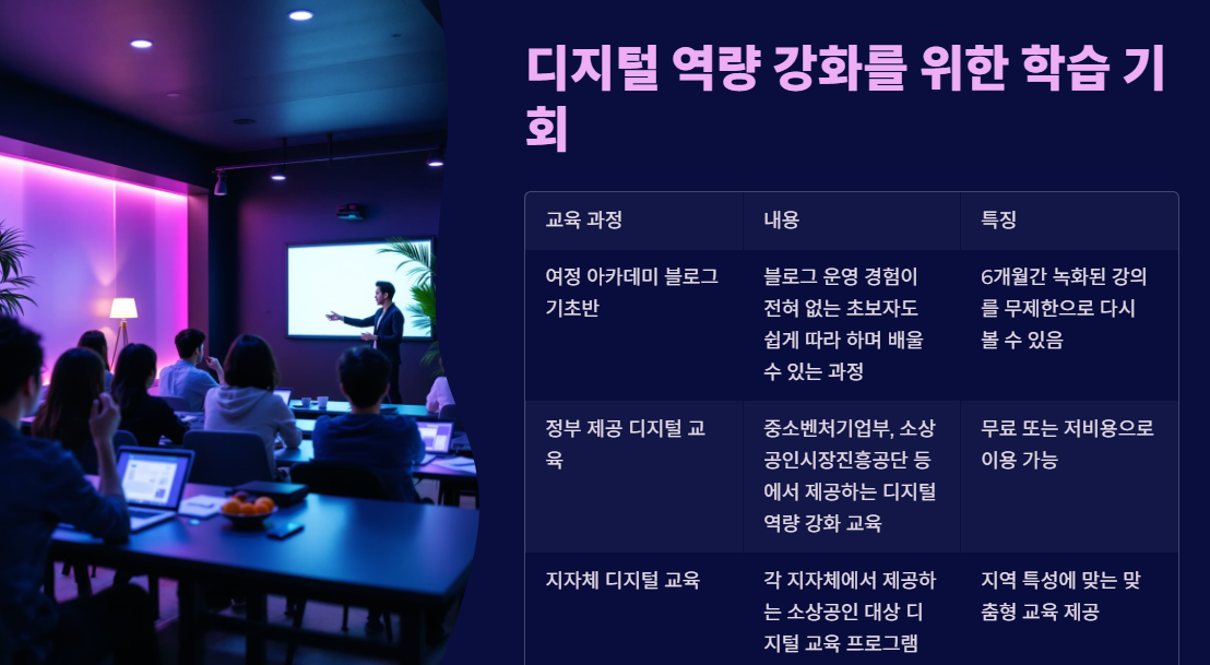 - 이 외에도 정부(중소벤처기업부, 소상공인시장진흥공단 등)나 각 지자체, 유관기관에서 제공하는 다양한 무료 또는 저비용의 디지털 역량 강화 교육 프로그램이 많으니, 적극적으로 찾아보고 참여하시는 것이 좋습니다.