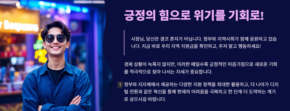 "사장님, 당신은 결코 혼자가 아닙니다. 정부와 지역사회가 함께 응원하고 있습니다. 지금 바로 우리 지역 지원금을 확인하고, 주저 말고 행동하세요!"