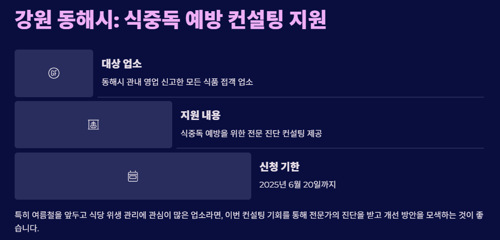 - 지원 내용: 식품 접객 업소를 대상으로 식중독 예방을 위한 전문 진단 컨설팅을 제공합니다. 별도의 비용 지원은 없지만, 위생 수준 향상에 실질적인 도움을 받을 수 있습니다.