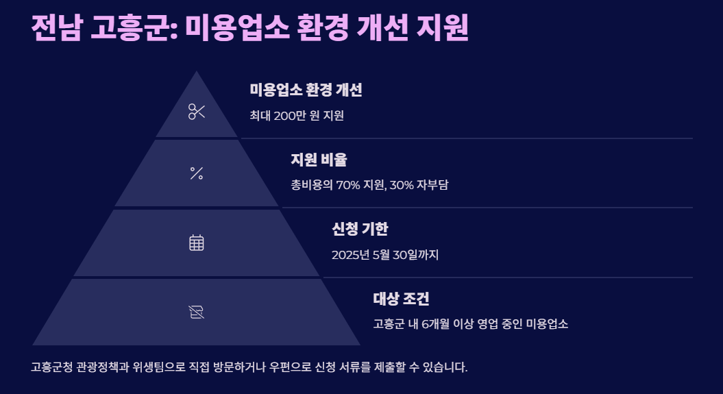 - 대상: 고흥군 관내에서 사업자 등록 후 6개월 이상 영업 중인 미용업소가 해당됩니다.