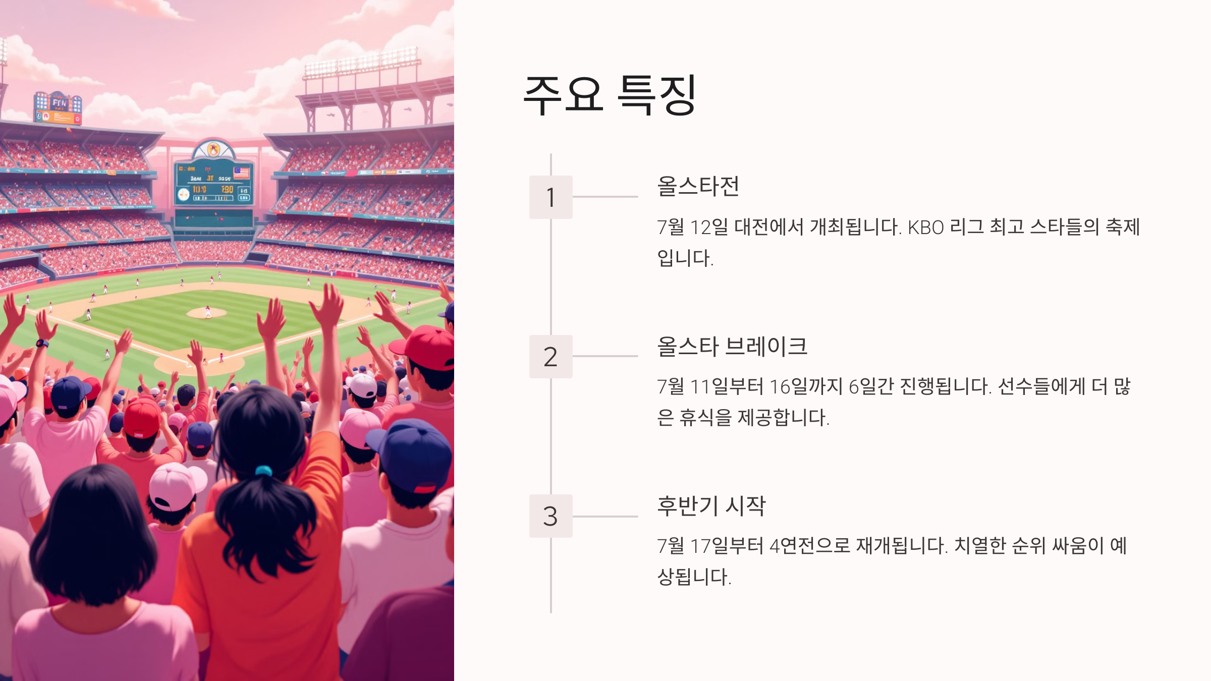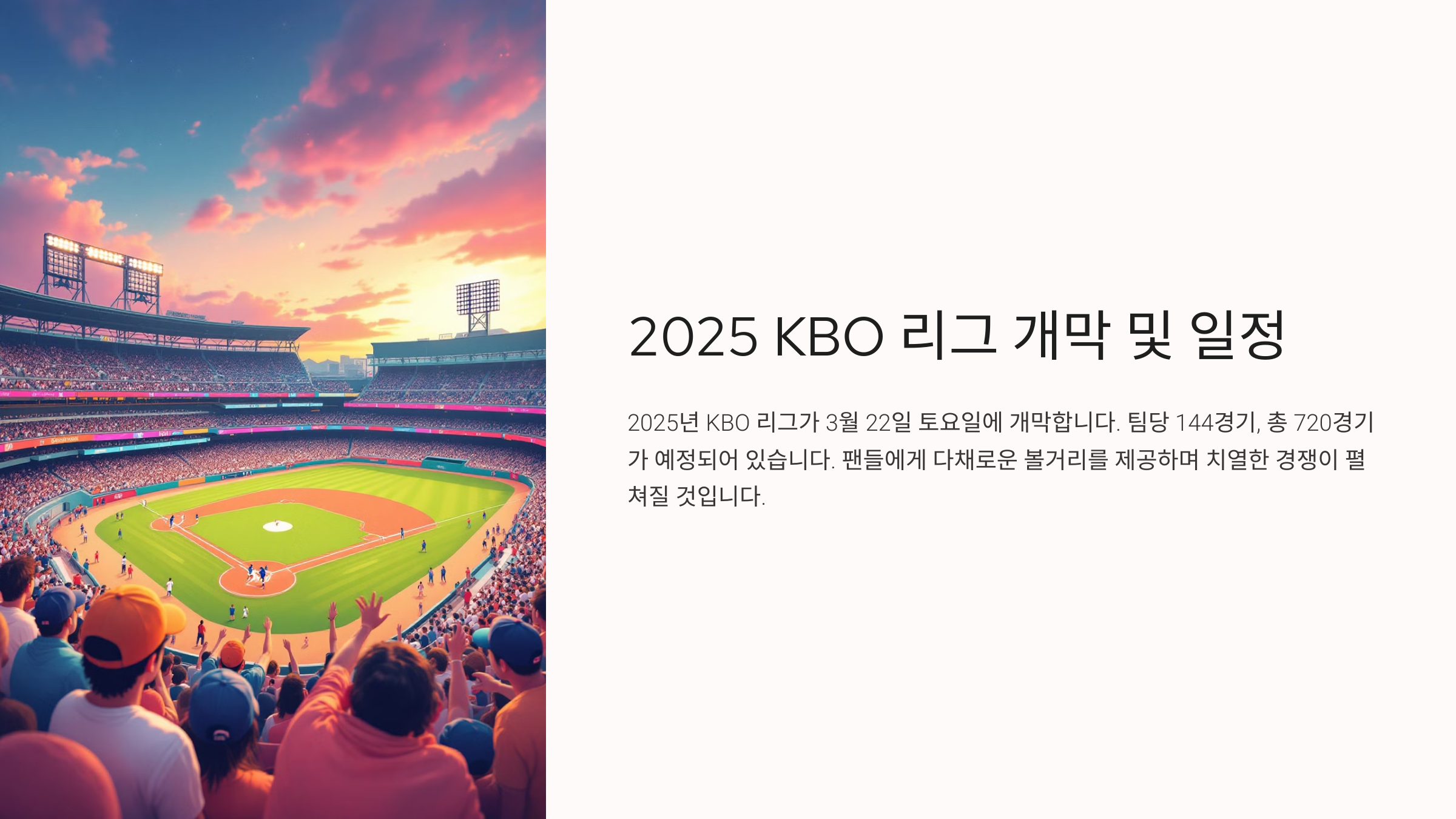 2025년 KBO 리그는 팬 친화적인 일정과 운영으로 관람 환경을 개선합니다. 혹서기와 공휴일 경기 운영에서 혁신적인 변화를 도입하며, 가족 단위 관객과 일반 관중 모두가 편안하게 경기를 즐길 수 있도록 다양한 노력을 기울이고 있습니다.