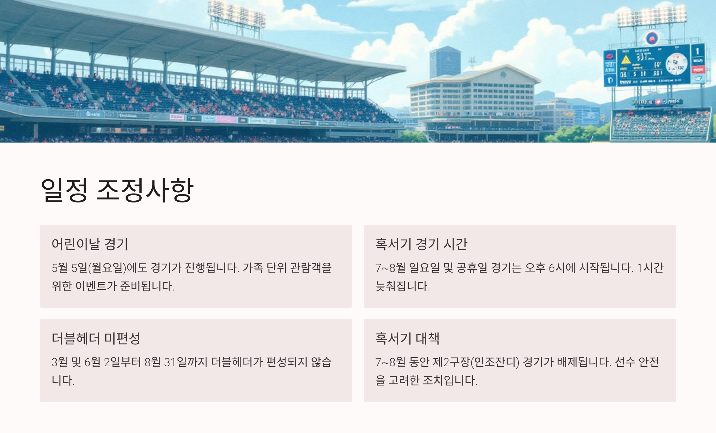 - 제2구장(인조잔디) 경기 배제: 7~8월 동안 인조잔디가 깔린 경기장에서의 경기가 배제됩니다.