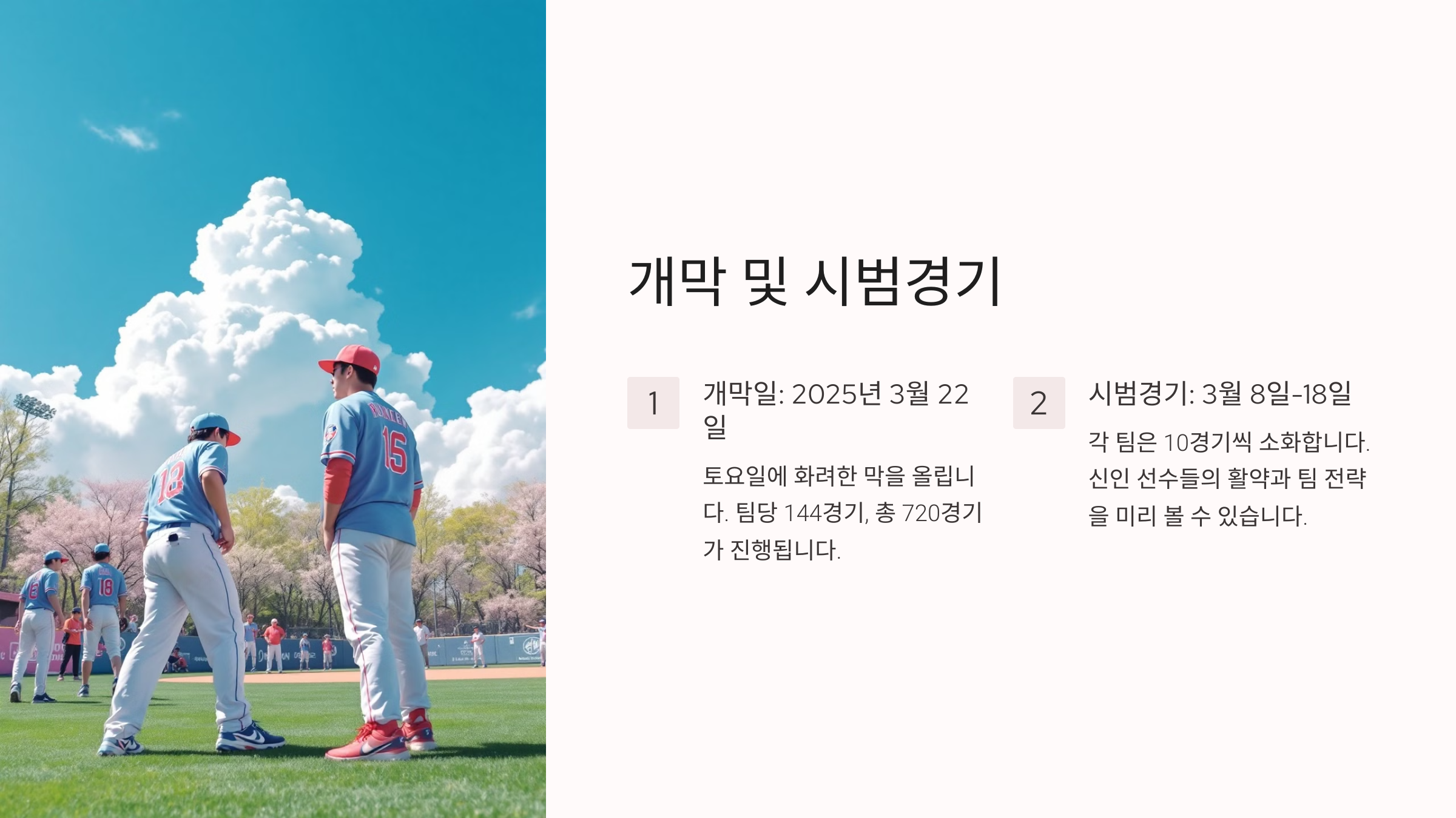 개막전은 상위 5개 팀의 홈구장에서 열리며, 각 구단의 새로운 전력을 확인할 수 있는 중요한 무대입니다.
