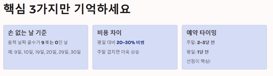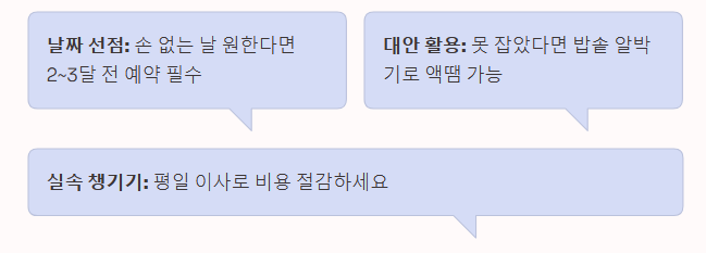- 예약 타이밍: 주말 손 없는 날은 최소 2~3달 전에, 평일은 1달 전에 예약해야 안전합니다.