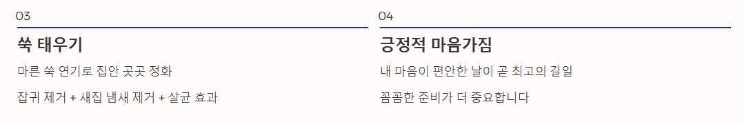 3. 쑥 태우기 마른 쑥을 태워 집안 곳곳에 연기를 피우면 잡귀를 쫓는 효과뿐만 아니라, 새집 냄새 제거와 살균 효과까지 얻을 수 있어 일석이조입니다.