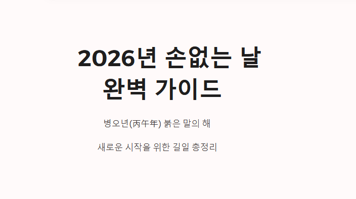 2026년 병오년(丙午年), 붉은 말의 해가 밝았습니다. 역동적이고 활기찬 기운이 가득한 새해를 맞아 이사, 결혼, 개업 등 인생의 중요한 행사를 계획하는 분들이 많습니다. 한국에서는 예로부터 큰일을 치를 때 손 없는 날을 택하여 액운을 막고 복을 비는 풍습이 있습니다.