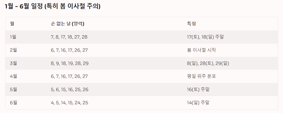 2026년 1년 동안의 손 없는 날을 월별로 정리했습니다. 특히 이사 수요가 많은 봄(23월)과 가을(910월)