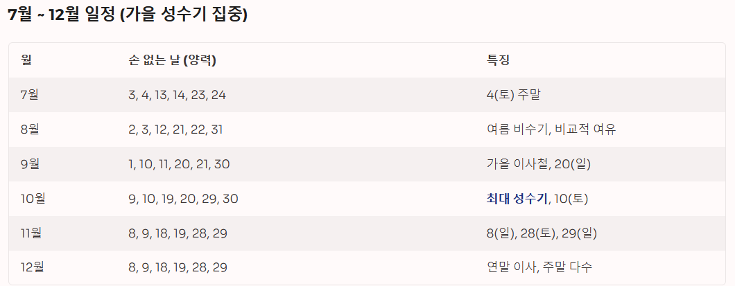 | 8월 | 2, 3, 12, 21, 22, 31 | 여름 비수기, 비교적 여유 |