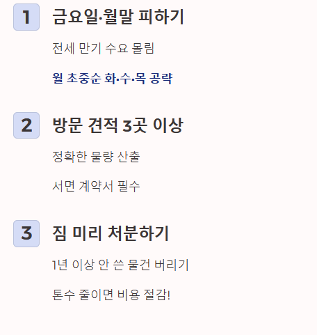 - 금요일과 월말 피하기: 손 없는 날이 아니더라도 금요일과 매월 말일(25일30일)은 전세 만기 등으로 수요가 많아 비쌉니다. 가능하면 월 초중순의 화, 수, 목요일을 공략하세요.