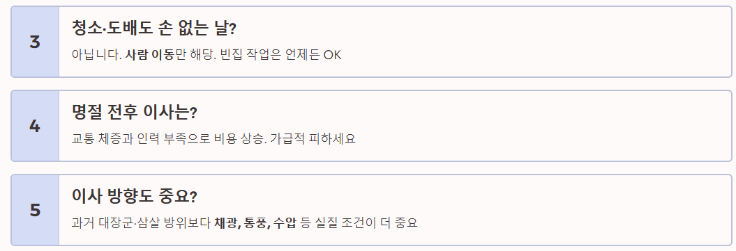 Q4. 2026년 설날과 추석 전후 이사는 어떤가요? 명절 연휴 직전과 직후는 교통 체증과 인력 부족으로 이사 비용이 상승하는 경향이 있습니다. 가급적 명절 주간은 피하는 것이 좋습니다.