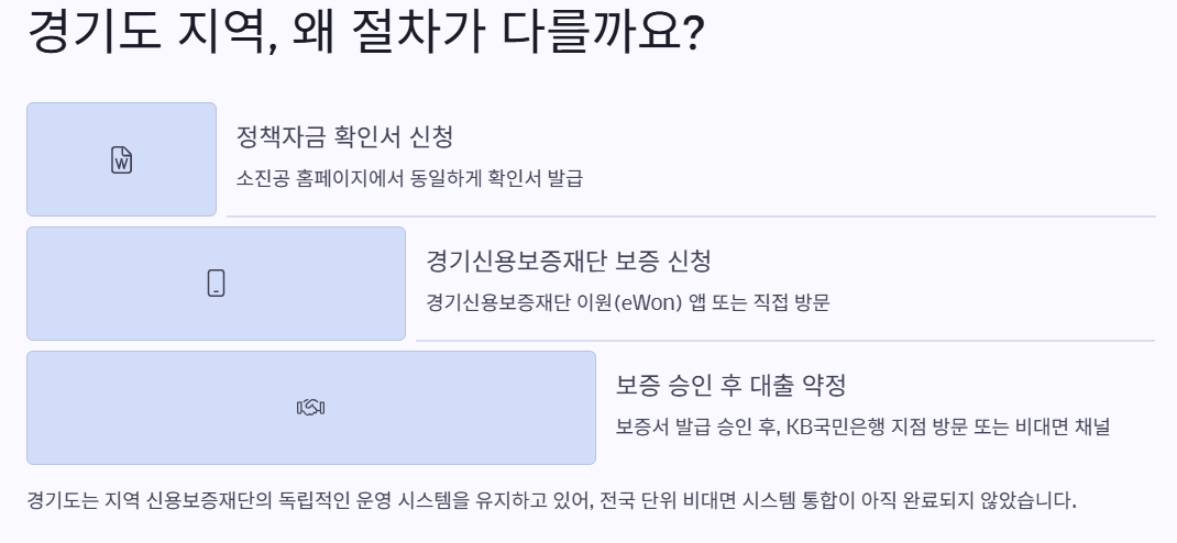 전국적으로 비대면 대출이 간편화되었지만, 경기도는 여전히 기존 방식으로 진행됩니다. 이는 경기도의 신용보증재단이 별도의 절차를 유지하고 있기 때문입니다.