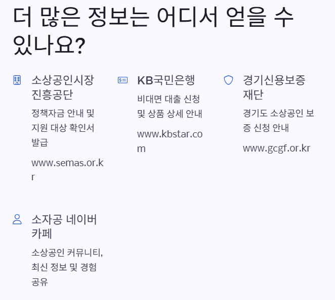 - 경기신용보증재단: 경기도 소상공인을 위한 보증 신청 안내(www.gcsf.or.kr).